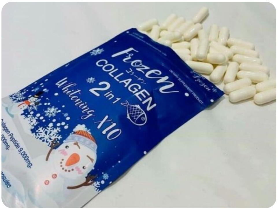 Frozen Collagen , made in Thiland 60 capsules provides a new way to promote beautiful skin with a new collagen formula for your naturally bright, rosy white skin. Frozen Collagen helps nourish your skin, hair, and nails, reduces the appearance of melasma, freckles, and dark spots on face and body, slows down the aging process as well as protecting your skin from sun damage to reveal your shining and healthy skin.