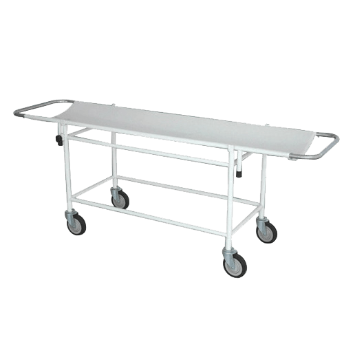 The trolley features a removable stretcher top made from Aluminum sheet, supported on a tubular frame, providing a comfortable and supportive surface for patients. Convenient pushing handles are located at both ends of the stretcher top, allowing for easy navigation and control during transportation.