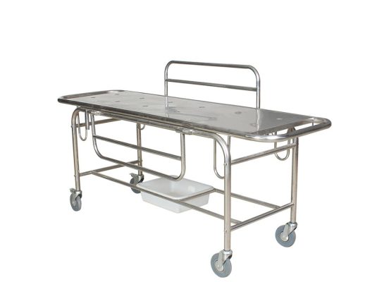 The trolley features a removable stretcher top made from Aluminum sheet, supported on a tubular frame, providing a comfortable and supportive surface for patients. Convenient pushing handles are located at both ends of the stretcher top, allowing for easy navigation and control during transportation.