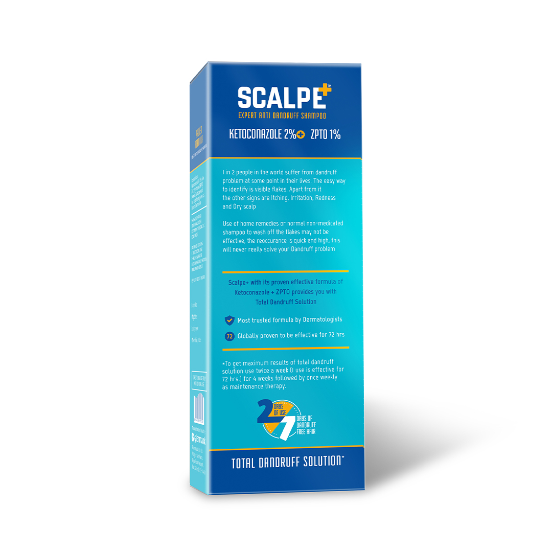Scalpe+ is an anti-dandruff shampoo for both men and women that is dermatologically tested. Scalpe+ gives you the total dandruff solution with 5 Xpert Benefits of Anti-dandruff, Anti recurrence, preventing itching, flaking, scaling, hair fall, and conditioning. As per the IMS prescription 2016, this shampoo is doctor’s most trusted anti-dandruff shampoo that gives you a lasting relief from dandruff.